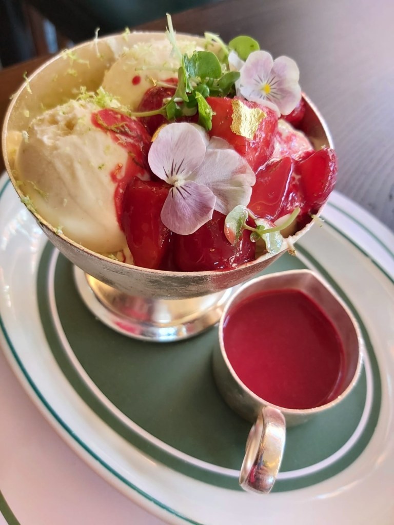 The non-alcoholic Porn Star Martini was perfect as was the Raspberry Eaton Mess. The raspberry coulis served with the dessert was delightfully tangy without a trace of sweetness which complemented the meringue, vanilla ice-cream and thick cream. I quite liked the lime zest and found I wanted more of that instead of the pea greens: which were very pretty but rather lost with the other big flavours.