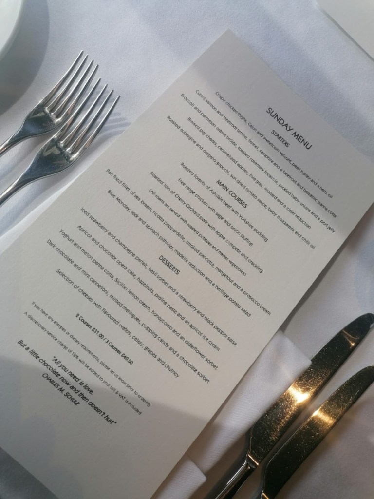 It had a relaxed formal fine dining feel, a friendly atmosphere, dedicated staff and was beautifully decorated, with a private conservatory area. The wine by the glass menu was great as was the selection for the rest of the wine list. The star of the show is the food, of course, with the Roast Beef and Yorkshire pudding a firm favorite during my Sunday lunch visit with them.